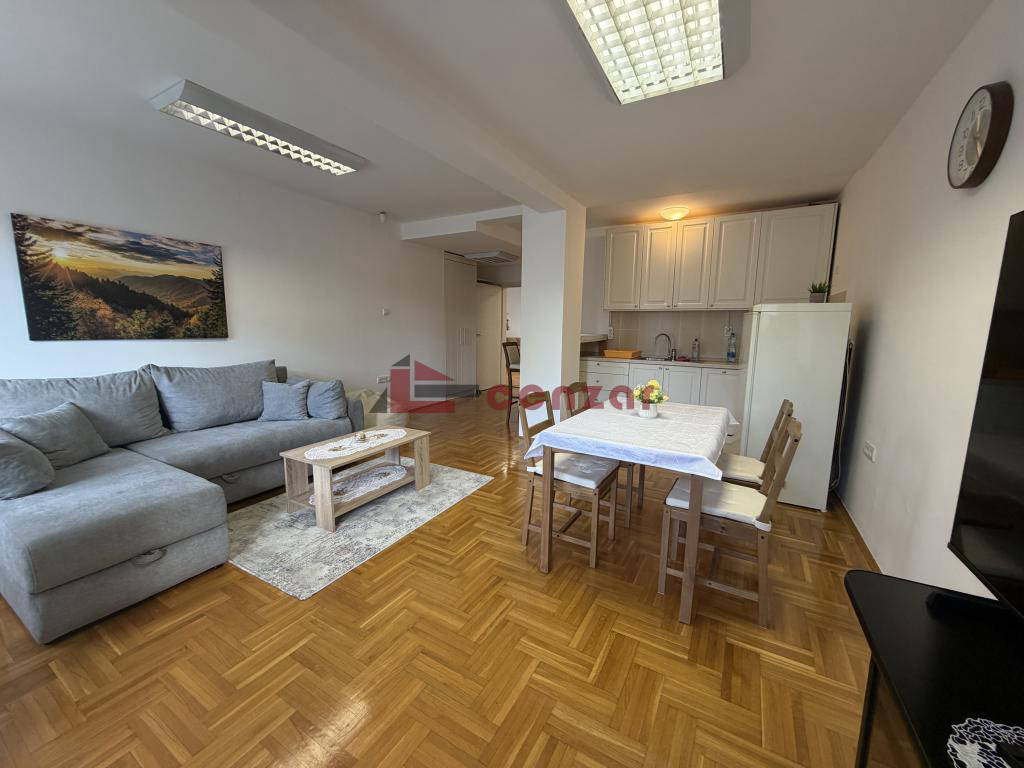 Izdaje se lepo namešten stan koji se sastoji od prostranog dnevnog boravka koji je povezan sa modernom kuhinjom i trpezarijskim delom.Iz dnevne sobe izlazi se na terasu koja gleda u dvorište.Spavaća soba opremljena je sa francuskim ležajem i garderoberom,kupatilo sa svim neophpdnim sanitarijama.Postoji poseban sanitarni čvor.Na podovima se nalazi parket,stolarija pvc,grejanje na gradsku toplanu sa alokatorima.Uz stan se dobija i obezbeđeno parking mesto u dvorištu zgrade.
